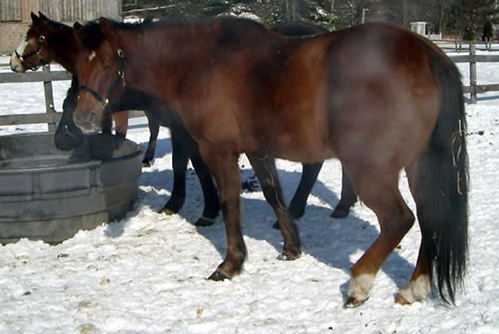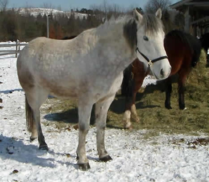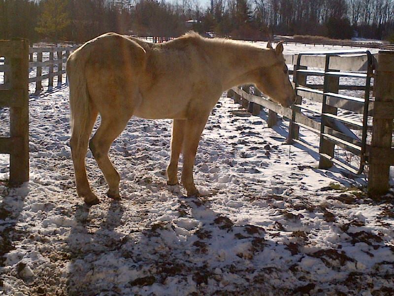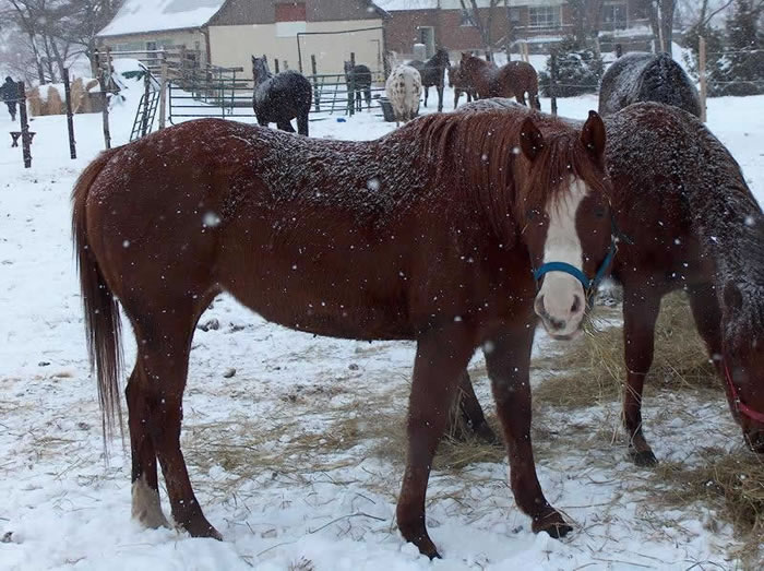A 30ish year old Quarter Horse whose showing days were over and had no place to go.He arrived Nov.25/09. He is a gentle boy. |