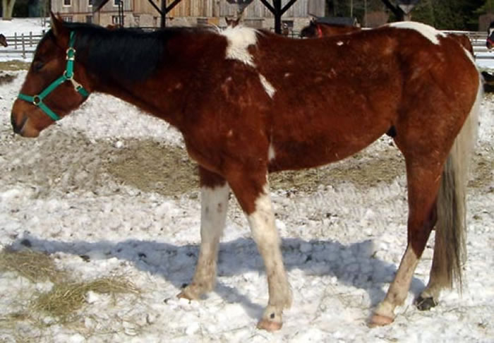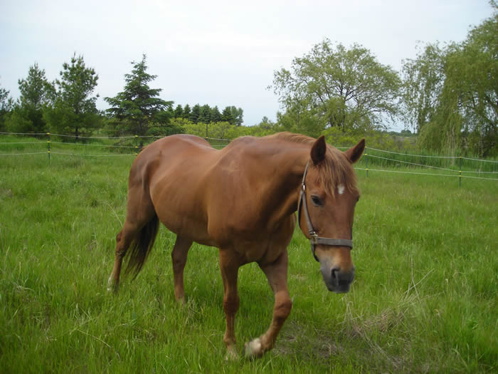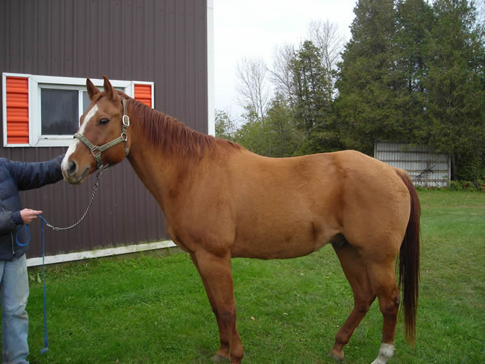 Our special 30ish year old Thoroughbred who also came from the feedlots in Alberta awaiting slaughter in 2002. So we are not sure of her age but she is definitely elderly but healthy and loves her retirement. She was adopted soon after her arrival but after checking on her in Barrie, she was not in good shape and they agreed for us to take her back. |