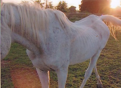 Patience - Patience had eyes with deep sunken sockets. The kind vet who tended to her felt we could save her but was concerned that there too much damage with her major organs. Amazingly there was no damage. Patience was so weak when she arrived, the vet had to give her several shots to give her the strength to stand. Her hide was so tough, the vet said it was like going through rhinoceros skin as there was absolutely no collagen or fat left. But Patience was one tough Arab and she came through. We started her slowly on beet pulp and good feed and vitamins and within a few months she gained around 400 pounds. She was the gentlest horse we have ever met.